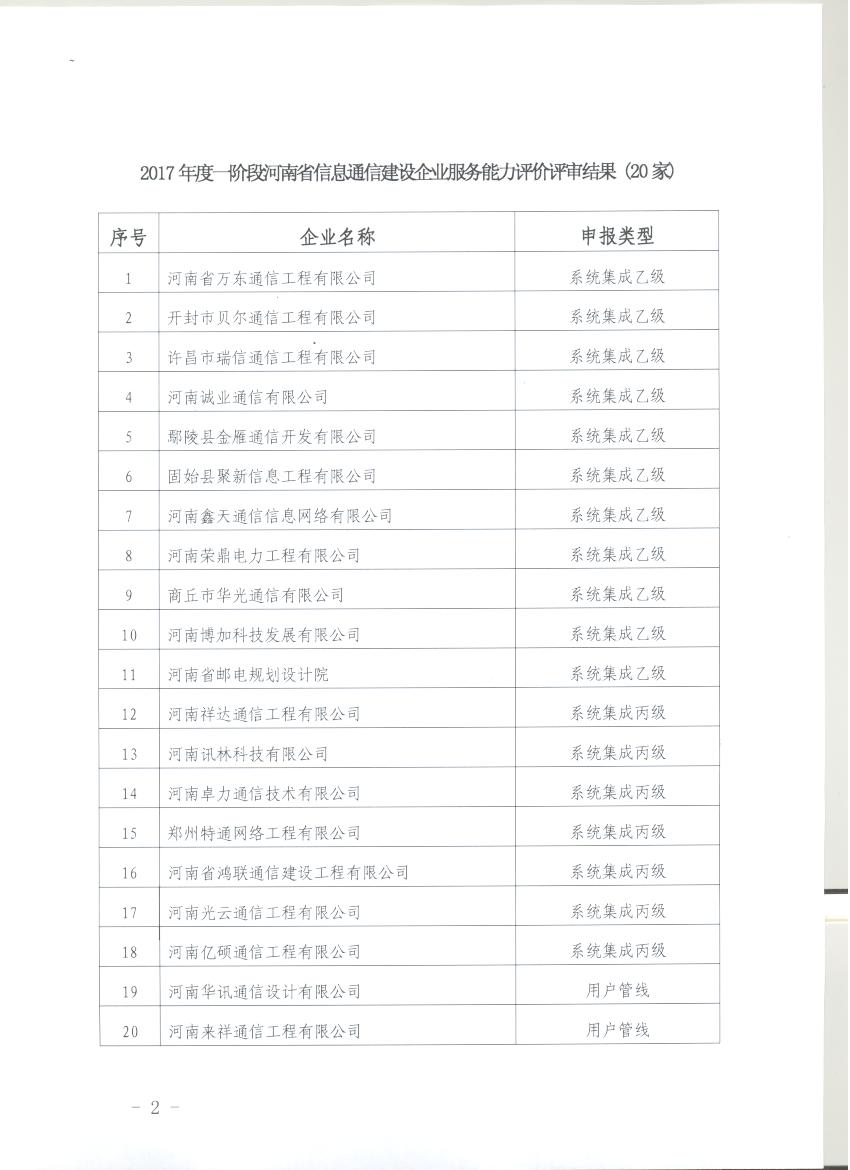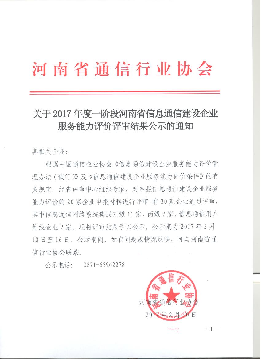 關于2017年度一階段河南省信息通信建設企業服務能力評價評審結果公示的通知