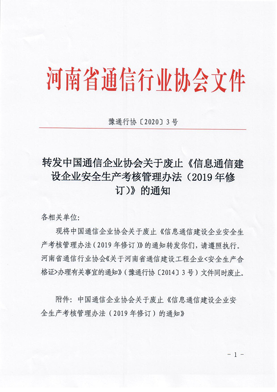 轉(zhuǎn)發(fā)中國(guó)通信企業(yè)協(xié)會(huì)關(guān)于廢止《信息通信建設(shè)企業(yè)安全生產(chǎn)考核管理辦法(2019年修訂)》的通知