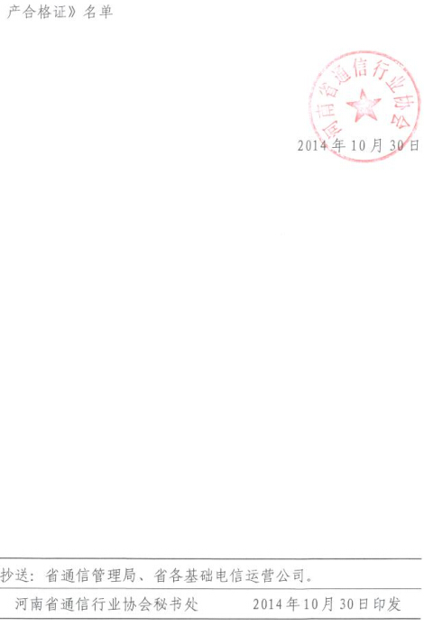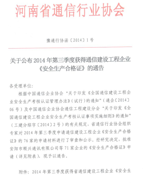 關(guān)于公布2014年第3季度獲得通信建設(shè)工程企業(yè)《安全生產(chǎn)合格證》的通告