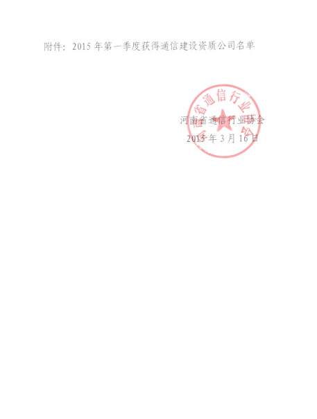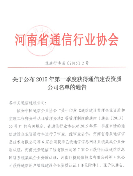 關(guān)于公布2015年第1季度獲得省通信建設(shè)企業(yè)資質(zhì)名單的通告
