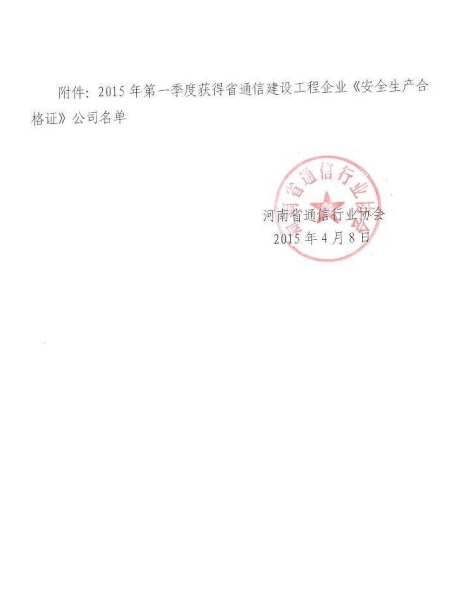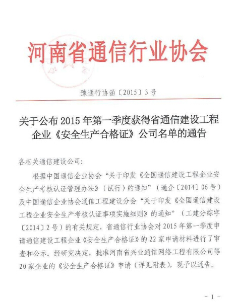 關于公布2015年第1季度獲得通信建設工程企業(yè)《安全生產(chǎn)合格證》的通告